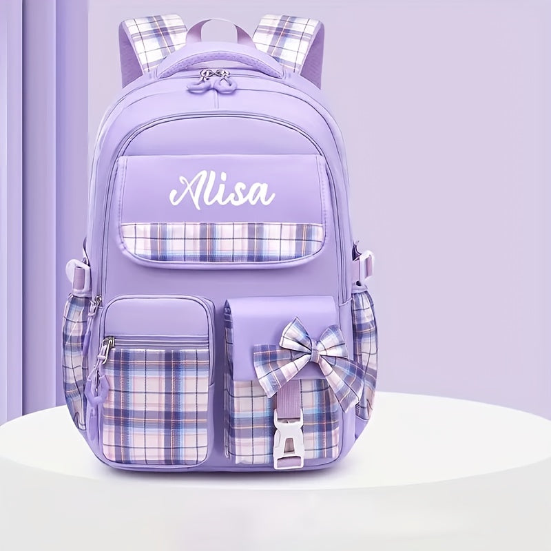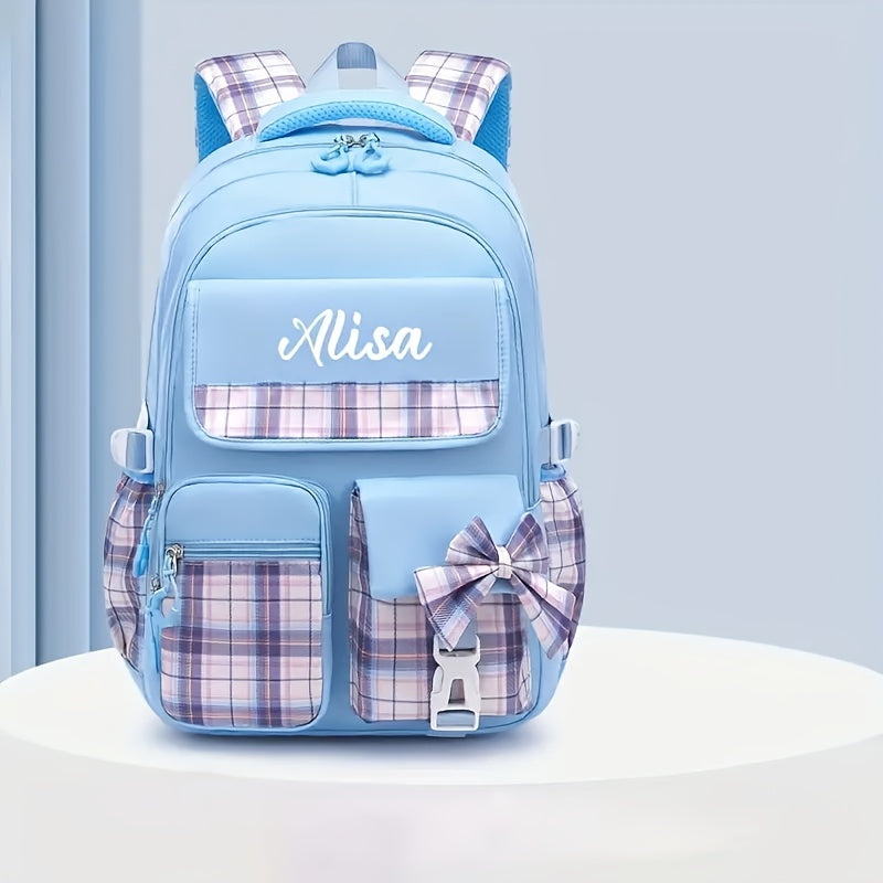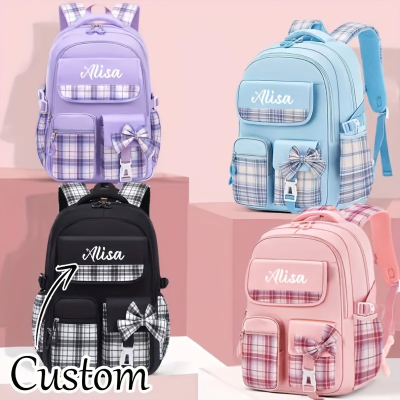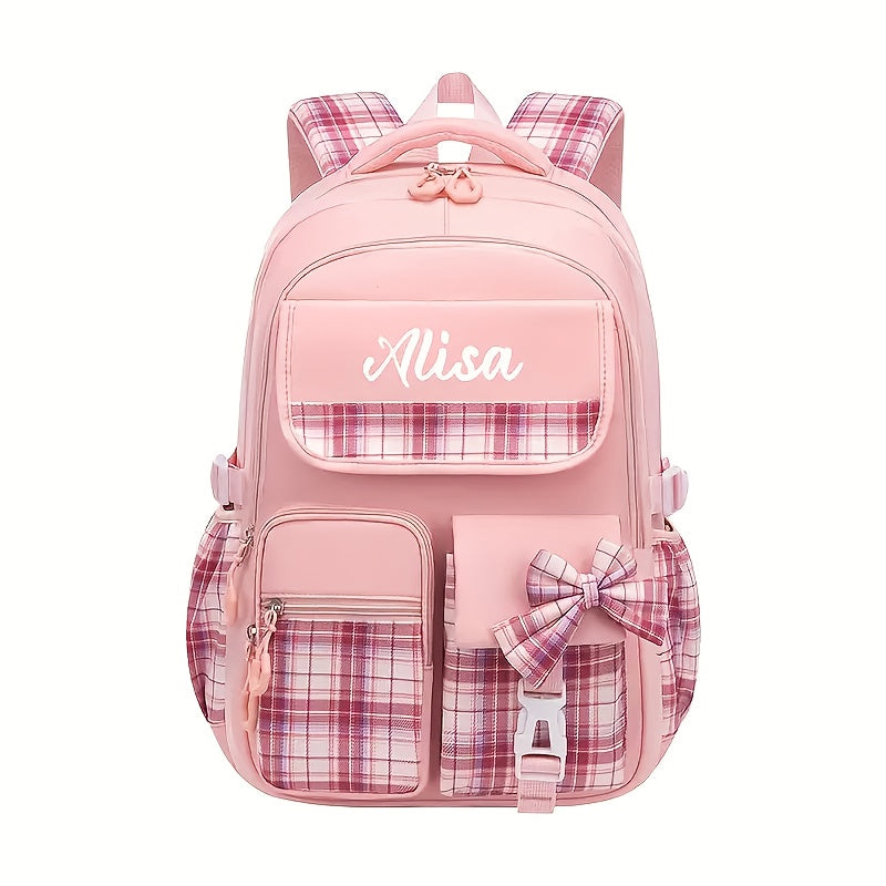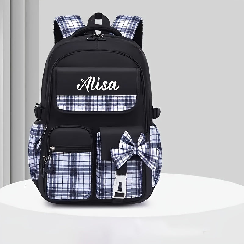 حقيبة ظهر أنيقة ومخصصة بتصميم مربعات مع قوس، تحتوي على مساحة كافية، مثالية للمدرسة أو السفر. هذه الحقيبة خفيفة للغاية وتحتوي على أحزمة كتف قابلة للتنفس، وتُعد هدية رائعة للعودة إلى المدرسة، خاصة للشباب.