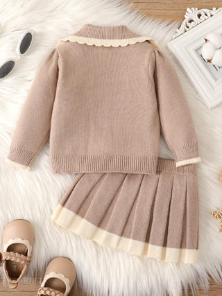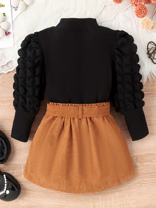 طقم أنيقة وأنيقة للفتيات الصغيرات من قطعتين، بلوزة محبوكة بأكمام طويلة وتنورة مع حزام فيونكة