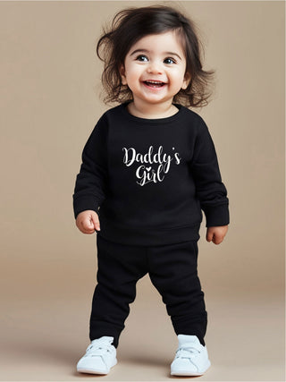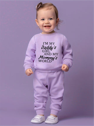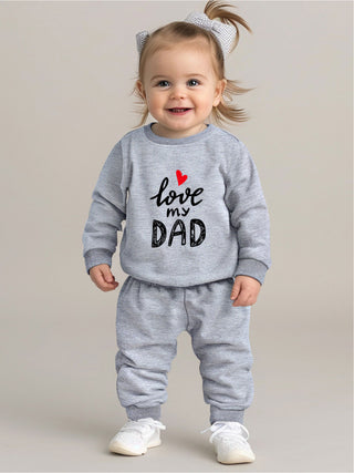 طقم ملابس أطفال رضع كرتونية لطيفة بلون سادة مطبوع عليها عبارة "أحب أبي" بكم طويل وياقة مستديرة وسروال رياضي كاجوال للبنات من قطعتين.