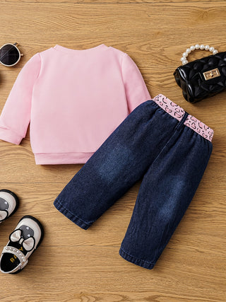 بات بات 2 قطعة سويت شيرت بناتي كاجوال مطبوع برقبة دائرية وأكمام طويلة وبنطلون جينز ممزق بحزام/بنطلون دينم للربيع والخريف/الخريف