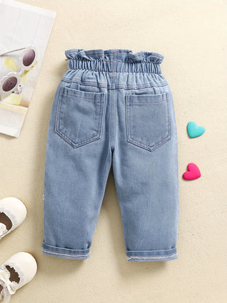 بنطلون جينز للأطفال الرضع والبنات الصغيرات، مطرز بقلب ملون عصري، مزين بأزرار، خصر مطاطي