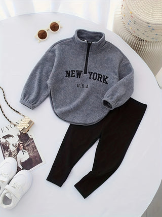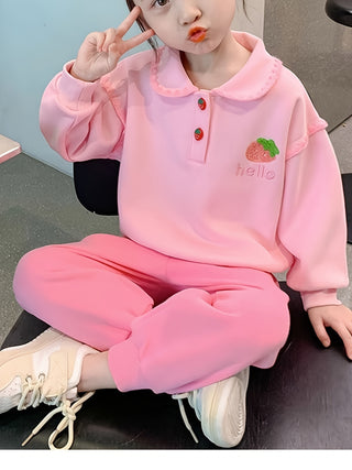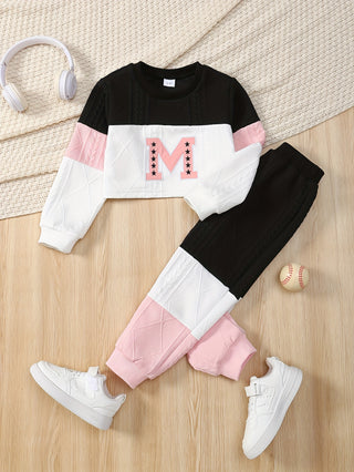 طقم أطفال برسمة كرتونية بلون سادة وطباعة حروف بأكمام طويلة وياقة دائرية، سويت شيرت بناتي وبنطلون كاجوال مكون من قطعتين، مثالي للخارج
