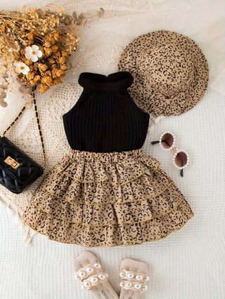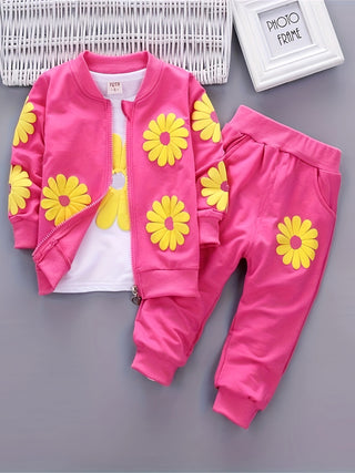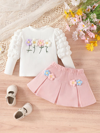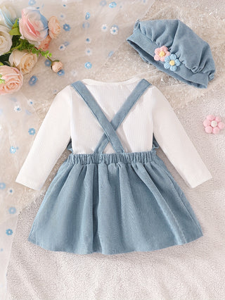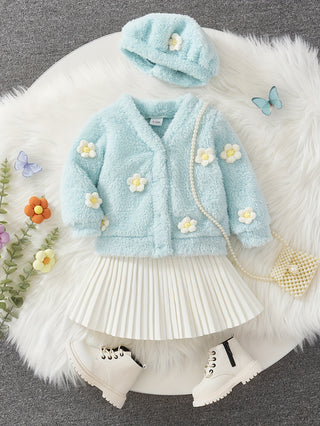 طقم أطفال من 3 قطع، قميص بأكمام طويلة وتنورة مع تطريز زهور ثلاثي الأبعاد بألوان عشوائية وقبعة، قماش بوليستر ناعم، ربيع/خريف