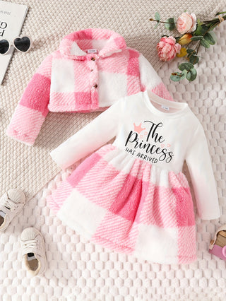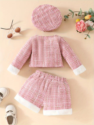 طقم ملابس الفتاة الرضيعة والطفلة: جاكيت تويد أنيق مزين بفرو + قبعة + شورت مزين بأزرار