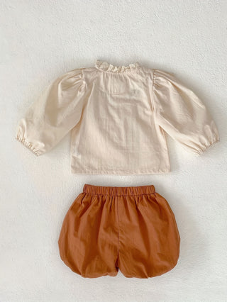 ملابس ربيعية للطفلة 100٪ قطن مطرزة بالزهور من الدانتيل قميص بأكمام طويلة + بنطلون شورت بلون سادة طقم من قطعتين خارج المنزل