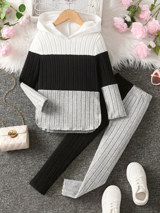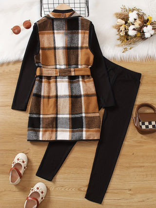 طقم ملابس أنيق للفتيات من 3 قطع: سترة مربعات مع ربطة أمامية، قميص محبوك برقبة عالية وبنطلون ضيق - مثالي للخريف/الشتاء