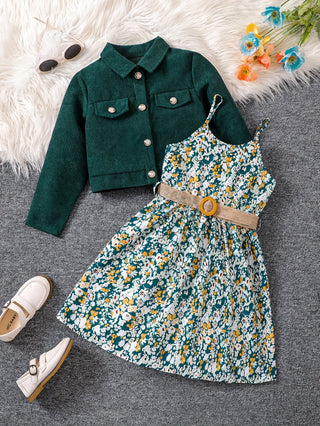 قطعتان، سترة أنيقة بأكمام طويلة وطية صدر للفتيات + أطقم فساتين بدون أكمام لهدايا الربيع والخريف خارج المنزل