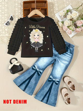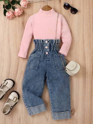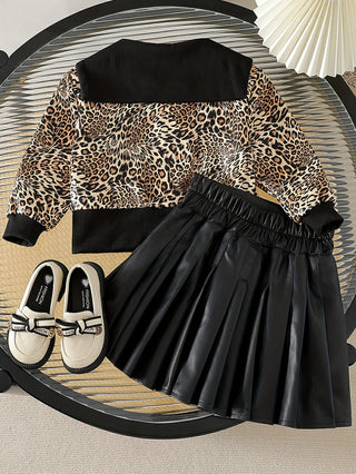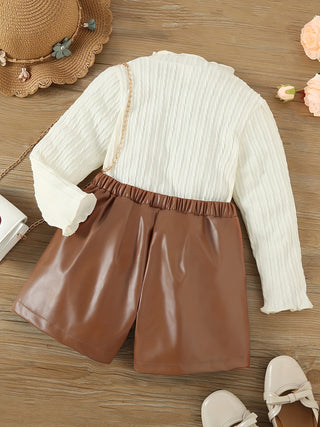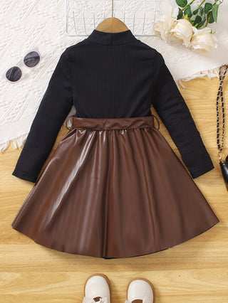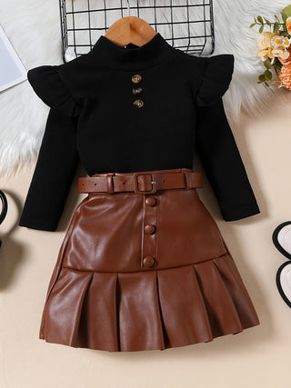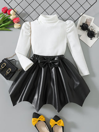 طقم أنيق للفتيات من قطعتين: تي شيرت بياقة عالية بلون سادة وتنورة بفيونكة من الجلد الصناعي - زي أنيق بأكمام طويلة للربيع/الخريف