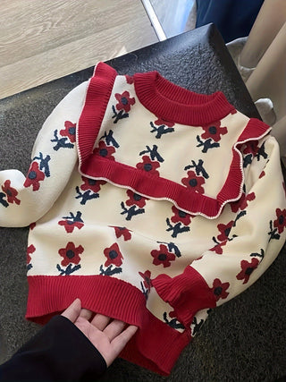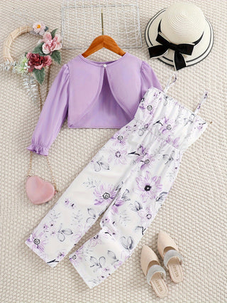 بنات صغيرات 2 قطعة ، سترة سادةة مزينة بكشكش و بذلة كاملة بطباعة زهرية ، ملابس أطفال لهدية الربيع والخريف ، ملابس خارجية للبنات