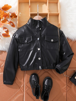 سترة جلدية صناعية بلون موحد للفتيات بأكمام طويلة وياقة مدببة، معطف دراجة نارية بأزرار أنيقة وعصرية لفصل الشتاء والخريف، هدية مبتكرة.