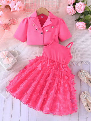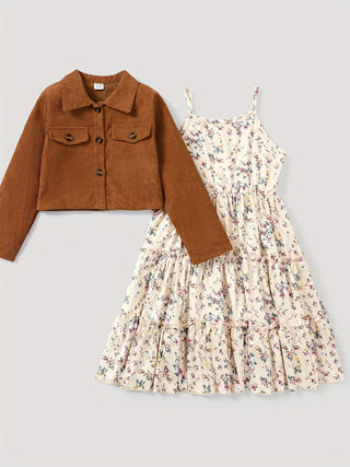 طقم فستان بطول الركبة بطباعة زهور بالكامل مع سترة بأكمام طويلة وأزرار أمامية لفتاة صغيرة، ملابس خارجية للفتيات