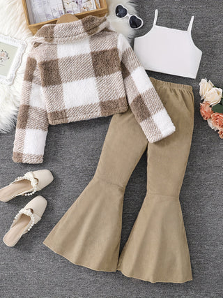 3 قطع، معطف من الصوف المربعات للبنات + قميص داخلي + بنطلون واسع - مريح وأنيق - ملابس شتوية وخريفية، هدية