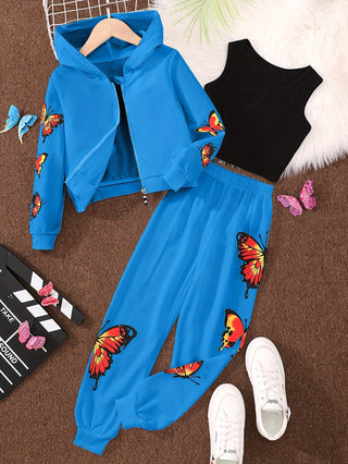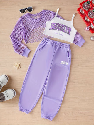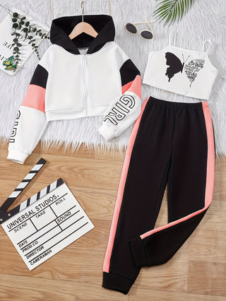 طقم رياضية للبنات 3 قطع، هودي قصير + توب شريطي بحروف + بنطال رياضي، ملابس خارجية كاجوال، هدية