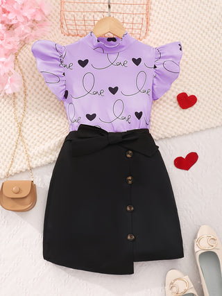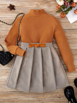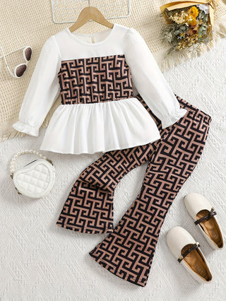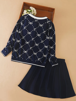 طقم كاجوال للفتيات مكون من قطعتين، بلوزة منقوشة بطبعة فيونكة وتنورة منقوشة، ملابس أطفال لحفلات الخريف