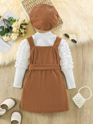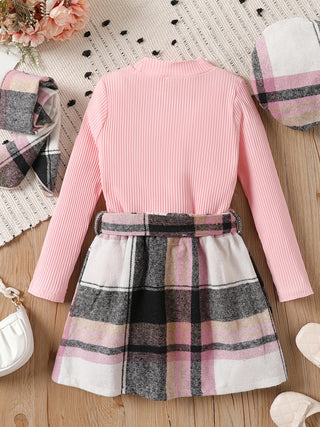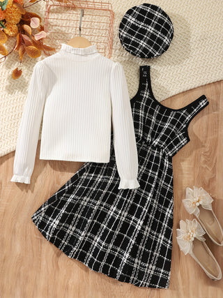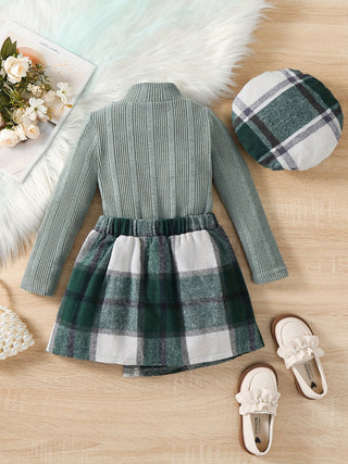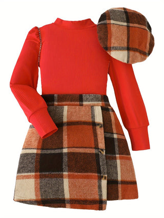 3 قطع من طقم منقوشة للبنات، بلوزة محبوكة برقبة وهمية وتنورة منقوشة مع قبعة - ملابس شتوية/خريفية، ملابس أنيقة ورائعة
