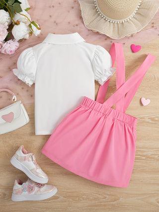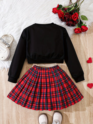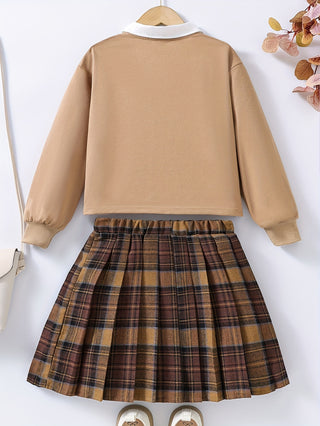 2 قطعة، بلوزة أنيقة للفتيات بياقة وهمية وأكمام طويلة + تنورة منقوشة - مريحة وتناسب نمط الحياة اليومي - ملابس الربيع والخريف، هدية