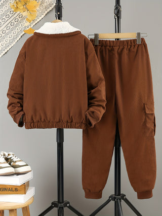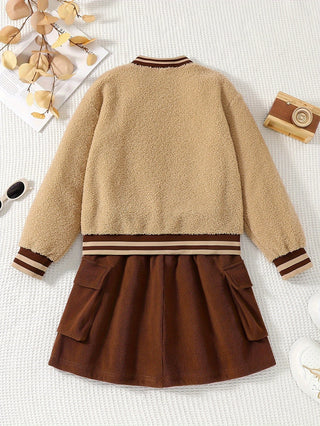طقم فتيات الخريف 2 قطعة طقم سترة بياقة كاكي مطبوعة بحروف وتنورة قصيرة منقوشة بطيات ملابس خارجية