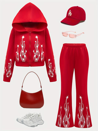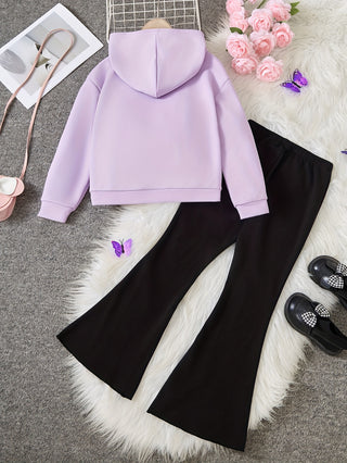 طقم للبنات: هودي بأكمام طويلة وطبعة فراشة + بنطلون جرس بطبعة فراشة 2 قطع، مثالي للخارج