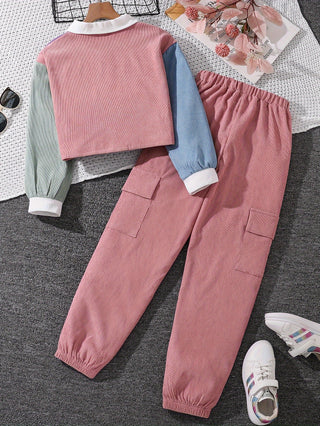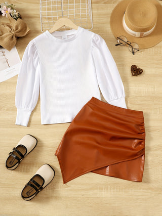 بلوزة بناتي من قطعتين بأكمام منتفخة وتنورة من البولي يوريثان ، مجموعة اشتباك اللون ، ملابس أطفال غير رسمية عصرية لربيع الخريف