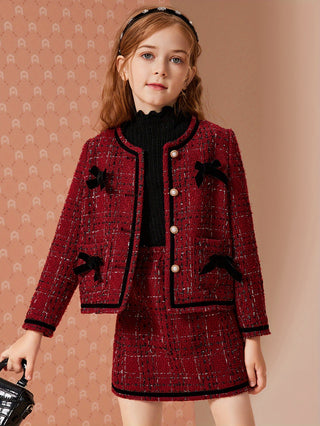 اطلبي للفتيات الصغيرات بدلة رائعة، مع تويد محبوك بياقة طاقم وقوسين + تنورة متناسقة مع ملابس الربيع والخريف