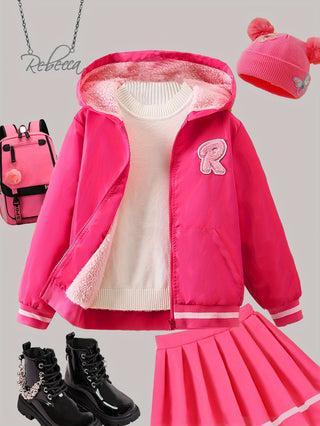 سترة بوليستر عارية للفتيات مع حروف مطرزة وتنورة قصيرة ضيقة، أكمام طويلة، تفاصيل سحاب، نسيج محبوك - مجموعة خريف/شتاء