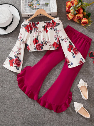 [2 قطعة] بلوزة رومانسية بأكمام مكشوفة بطباعة زهور + بنطلون بقصّة واسعة من الخس - مثالي لحفلات الربيع والخريف وهدايا العطلات
