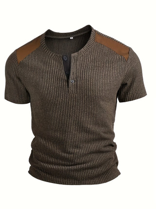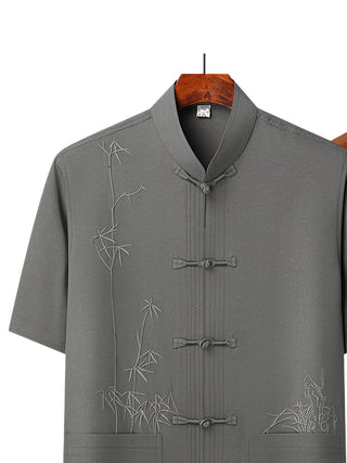 قميص رجالي بأكمام قصيرة بأزرار بطباعة هندسية من القطن الخالص بياقة واقفة، قميص علوي للترفيه للصيف والمنتجعات الخارجية اليومية