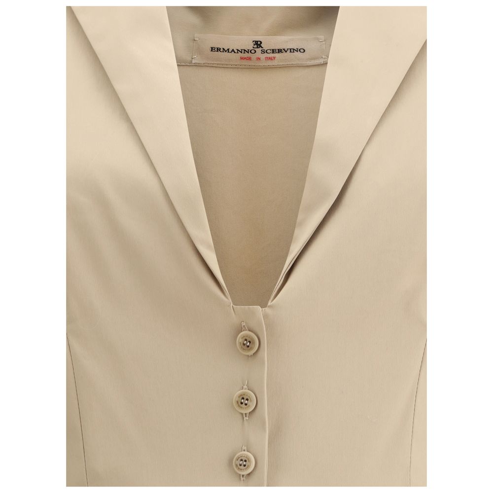 Ermanno Scervino’s chemisier Dress is a masterpiece of elegance and femininity. It features a short-sleeved design and a deep V-neckline on the front, giving it a sensual and refined touch. The peaked lapel adds a note of sophistication to the design. The front button closure emphasizes the classic look, while the fitted waist enhances the silhouette, complemented by a flared skirt that lends movement and lightness. The side zipper closure ensures a perfect fit.