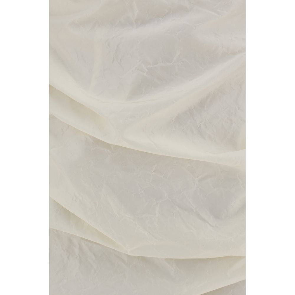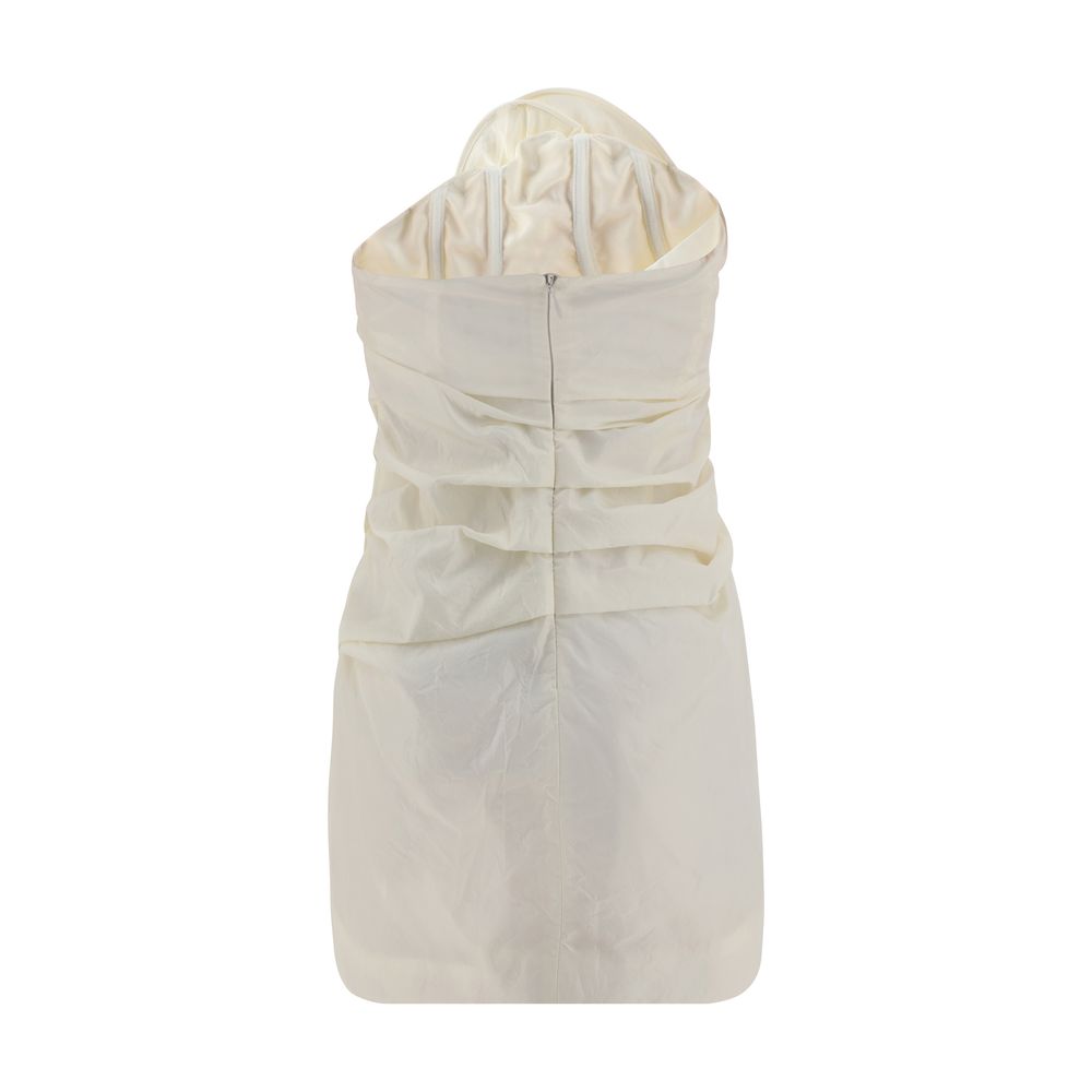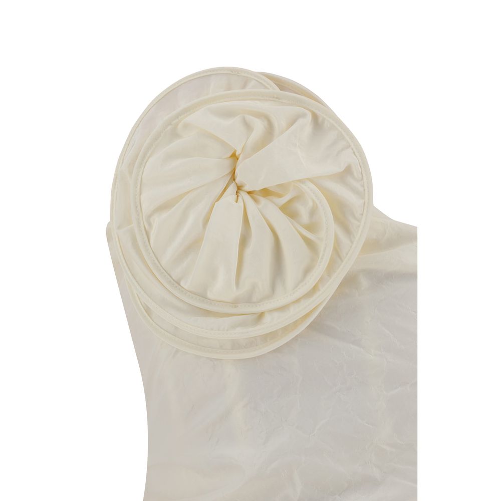 Silk Mini Dress by Magda Butrym, ruched silk fabric, curved asymmetrical neckline, off-shoulder neckline design, three-dimensional maxi flower applique on front, ruched fabric mini skirt, back closure by invisible zipper.