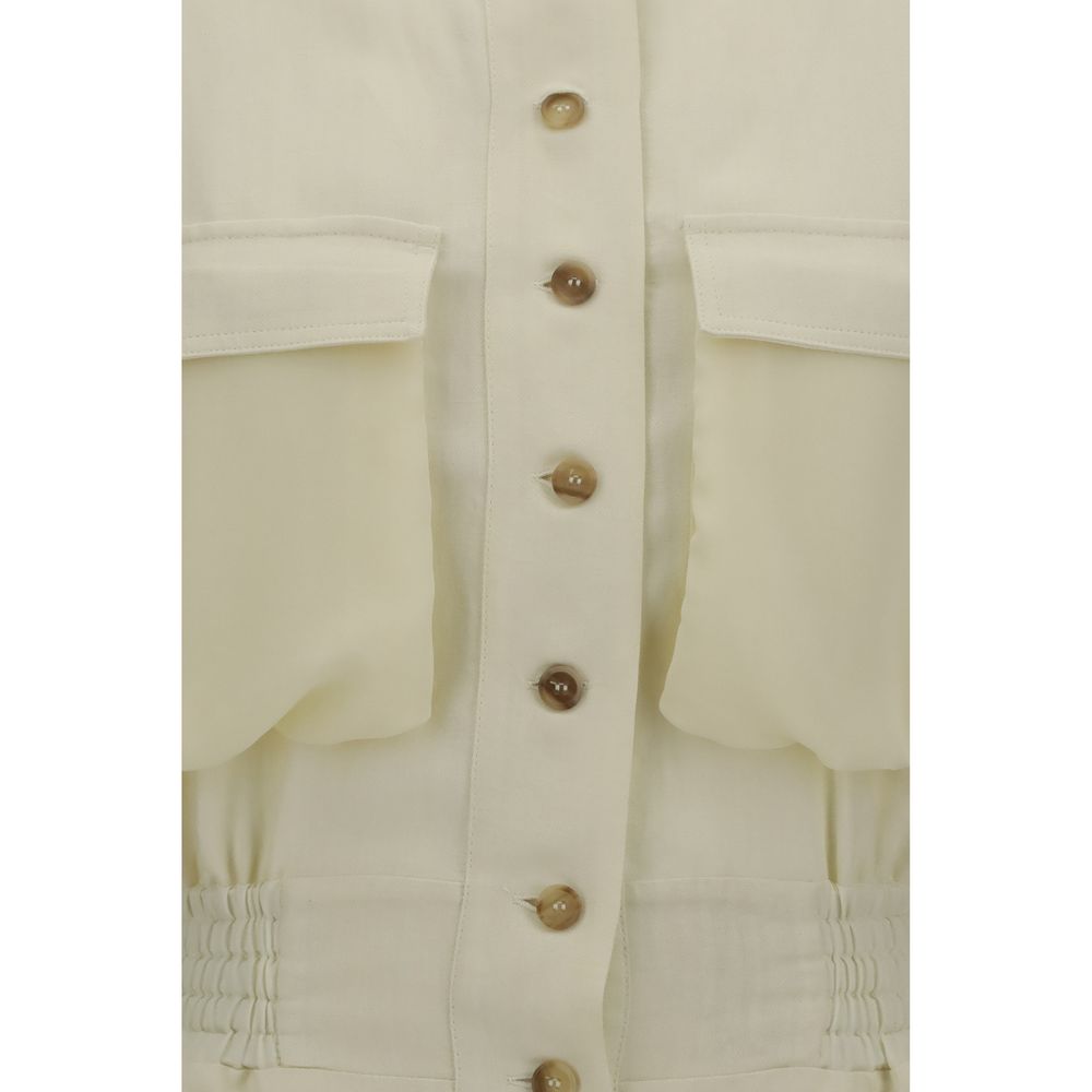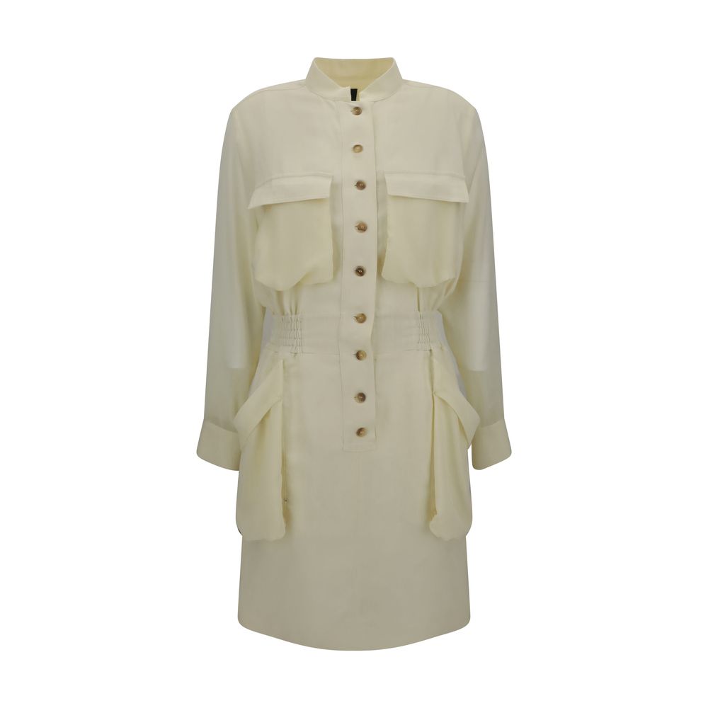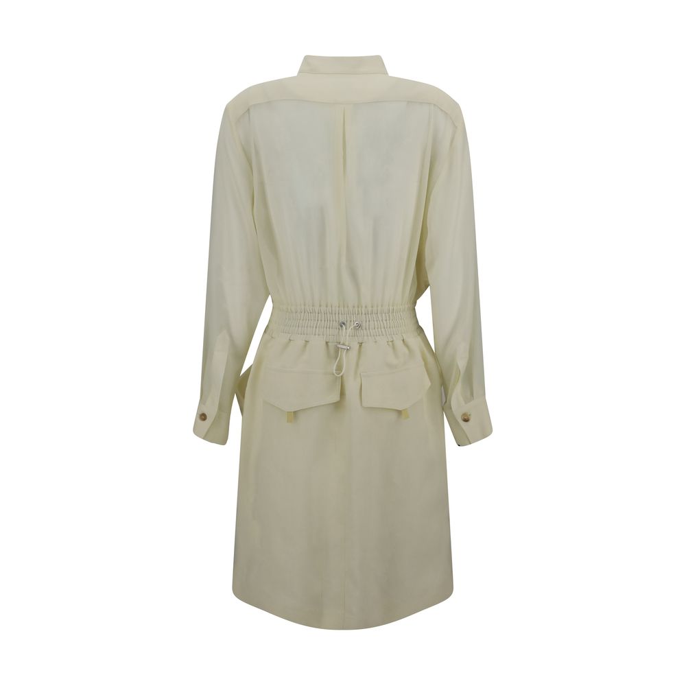 Pinko’s linen chemisier Dress is a garment with a casual and sophisticated spirit, designed for casual yet detail-oriented elegance. The design features a partial front button closure and a standing collar that lends structure to the garment. Long sleeves in semi-transparent georgette add lightness and femininity, complemented by button cuffs for a classic touch. Functional and versatile, the dress is enriched with numerous pockets: flap appliqués on the chest, on the hips and on the back with welt pockets. The waist is defined by an elastic band with adjustable drawstring at the back, allowing you to naturally modulate the fit.