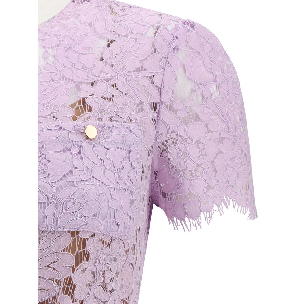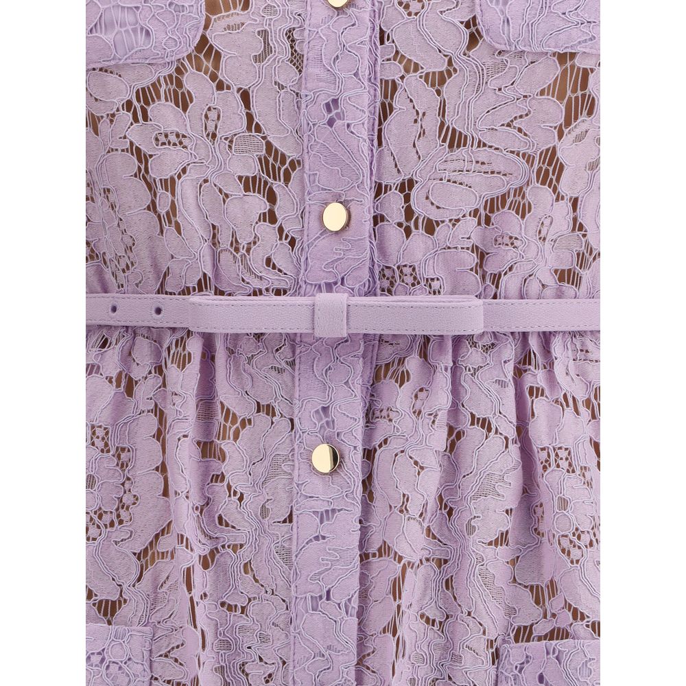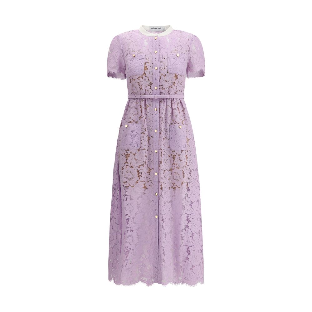 Self-Portrait’s Lace Long Dress combines elegance and tailored detailing. Crafted from delicate lace, it features a contrasting crew neck, front button closure and four front patch pockets. Short sleeves and a matching adjustable belt at the waist complete the design, enhancing the silhouette with a sophisticated touch.