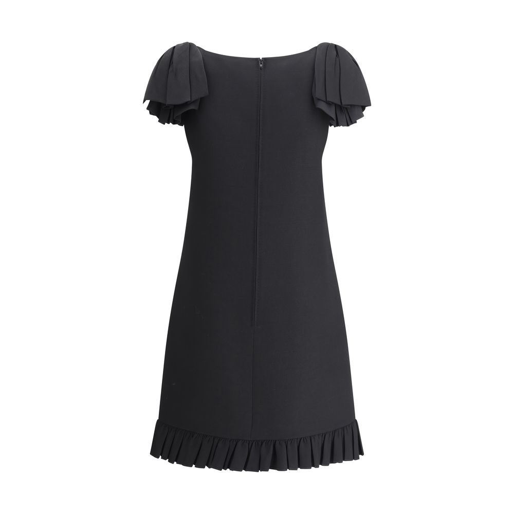 Valentino’s mini Dress with bows features a semi-fitted silhouette that flatters the figure with elegance. The sleeveless design and boat neckline give a sophisticated touch, while the decorative bows on the shoulders add a feminine and romantic accent. The small ruffle at the bottom gives delicate movement to the dress. Pockets on the hips offer practicality, while the back zipper closure ensures a perfect fit. A versatile garment, ideal for formal or informal occasions, with a refined mix of classic style and modern details.