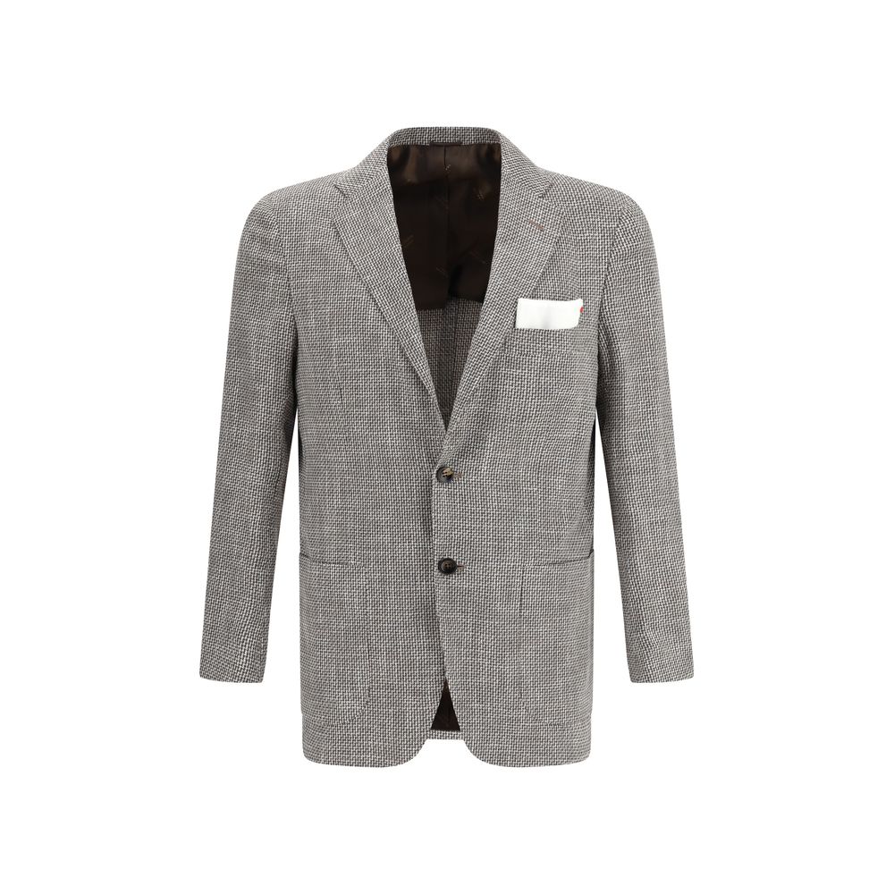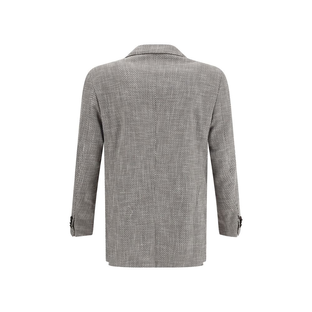 Kiton’s virgin wool Blazer Jacket is an elegant and refined garment made of fine virgin wool that ensures comfort and quality. It has classic lapels and a single-breasted button closure for a sophisticated and timeless look. On the front, it features two patch welt pockets and a slit pocket with a distinctive detail: an inserted logoed handkerchief, which adds a touch of originality. The jacket is complemented by two back slits that provide freedom of movement and an excellent fit. The geometric pattern lends a modern touch to the design, making it perfect for those seeking a balance between classic elegance and contemporary style.