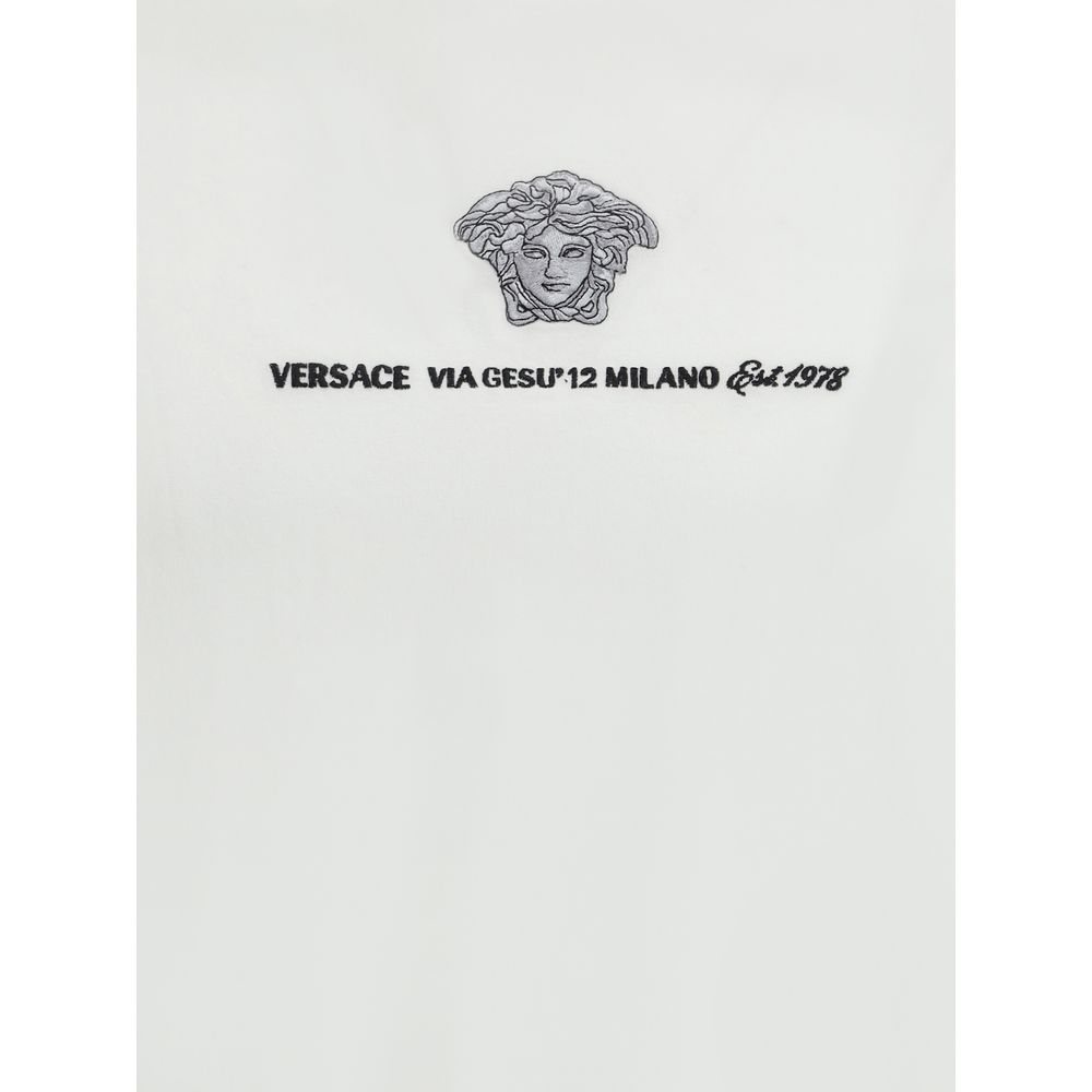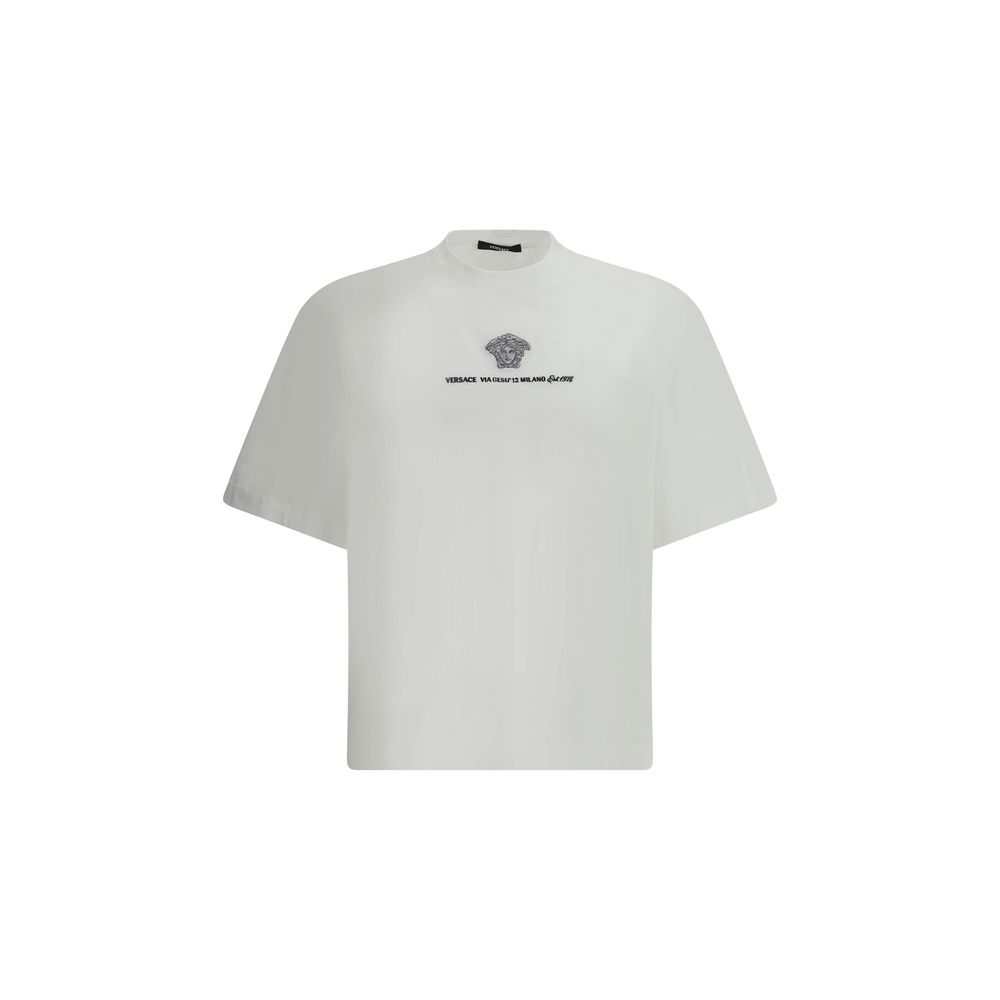 Cotton T-Shirt by Versace, ribbed crew neck, contrasting iconic brand monogram on front, monochrome pattern, regular fit.