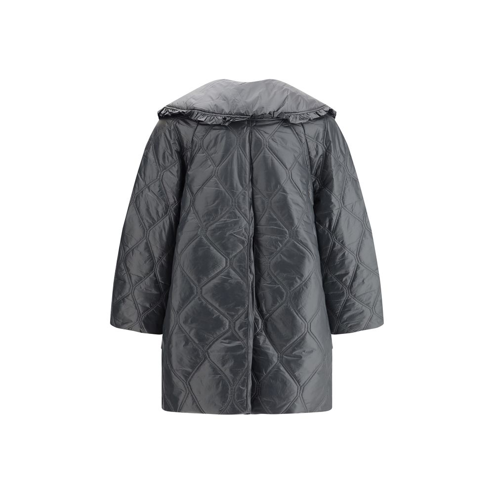 Ganni’s Jacket features a wide classic collar and a front zipper closure. The oversized design features raglan sleeves and a quilted pattern throughout. Two maxi welt pockets stand out on the front, enhanced by the iconic tone-on-tone monogram detail, which adds a distinctive touch to the garment.