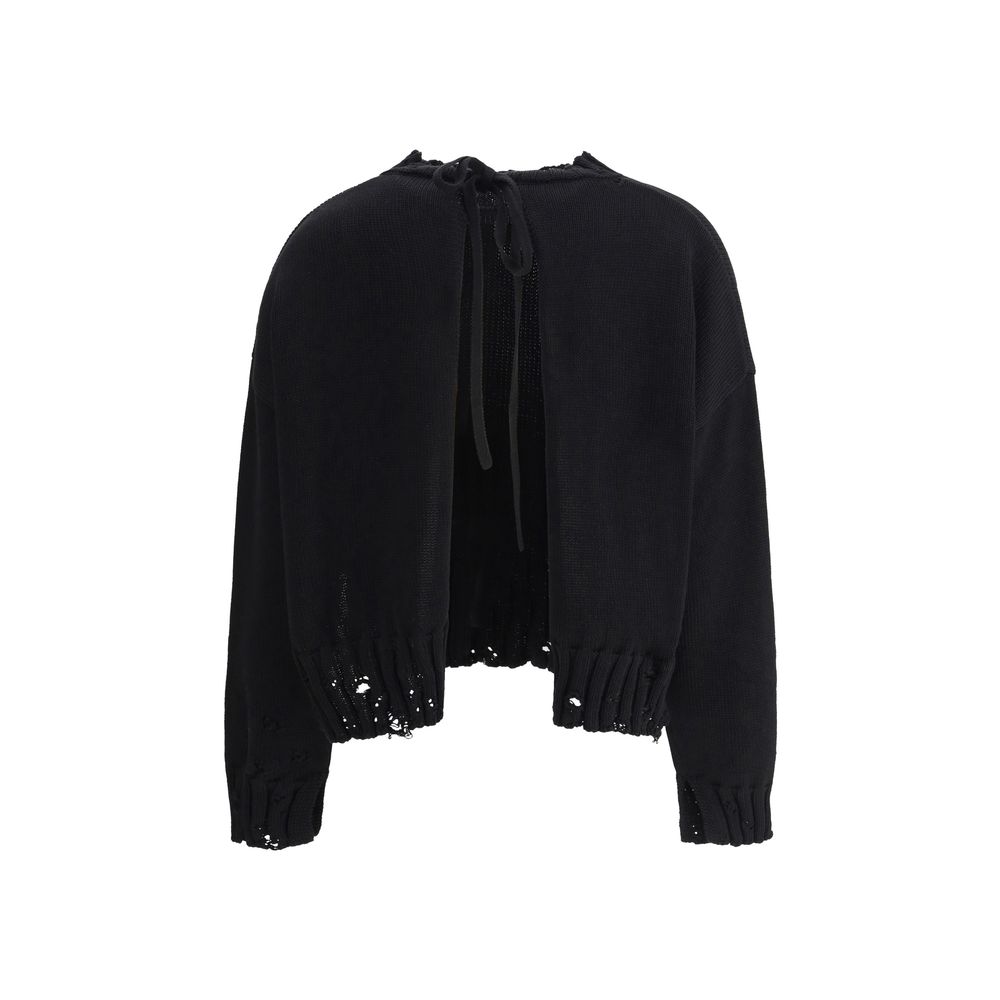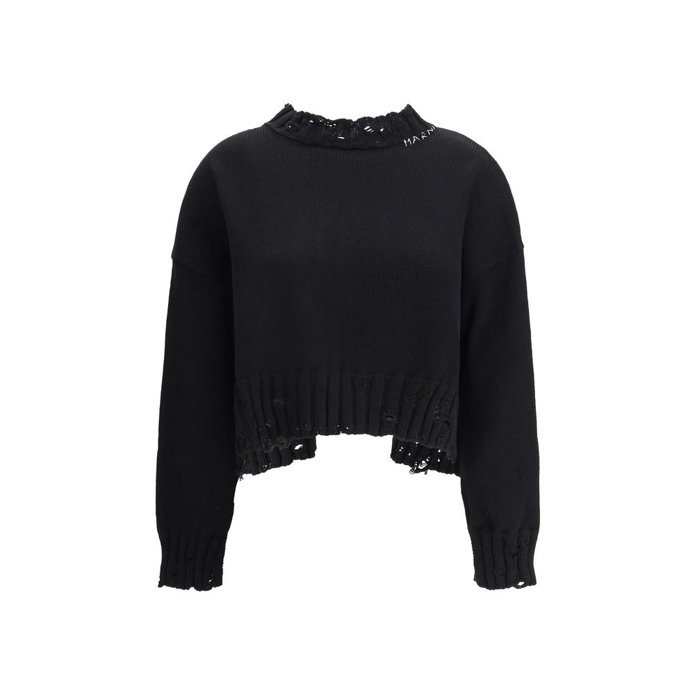 Marni’s Cut-Out Sweater combines sophisticated details with a bold design. The ribbed crew neck is embellished with monogrammed stitching, while the ribbed hem and cuffs lend an elegant finish. Dropped shoulders offer a relaxed fit, while the cropped pattern adds a contemporary silhouette. The cut-out detail on the back, complemented by ribbons, gives a distinctive and modern touch, making this sweater a unique and versatile garment for an on-trend look.