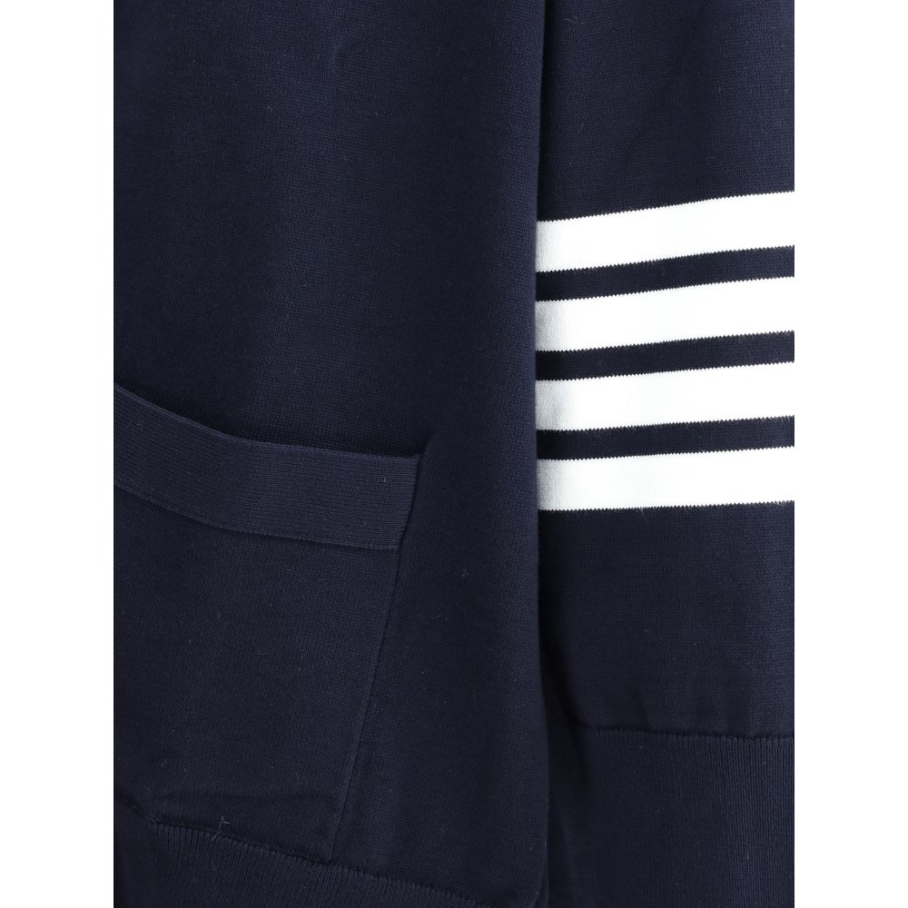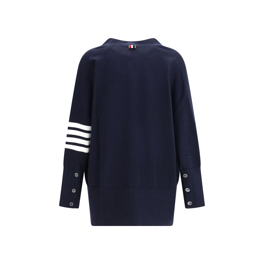 Thom Browne’s oversized Cardigan features an elegant V-neck and front button closure. The garment is embellished with a striped grosgrain detail under the placket and raglan shoulders, enhancing its contemporary design. The distinctive white 4-Bar detail on the left sleeve and striped grosgrain tab behind the collar add a distinctive touch. With two patch pockets on the front and ribbed trim, this cardigan combines style and comfort in a refined way.