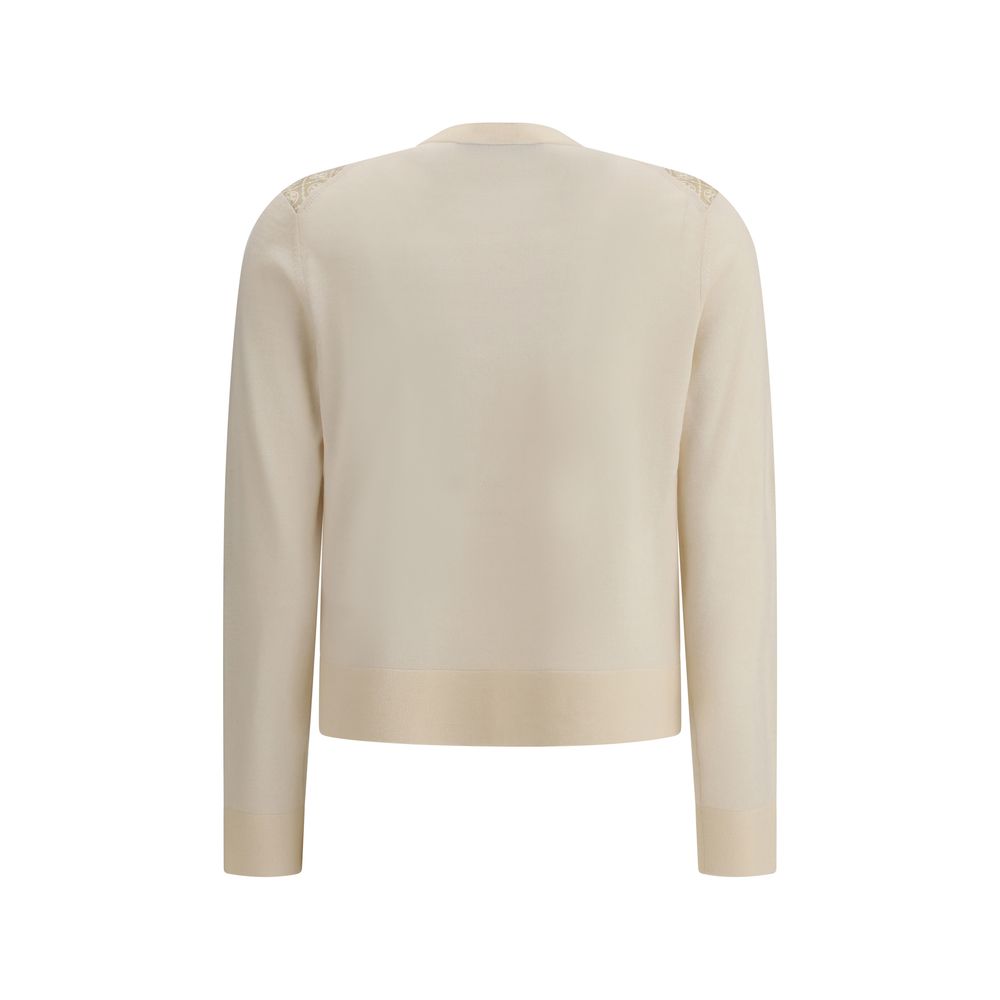 The Tory Burch silk and wool Cardigan is an elegant piece that strikes the perfect balance between comfort and sophistication. With its V-neck, this cardigan offers a delicate and sophisticated fit, while the ribbed hem and cuffs add a touch of texture that flatters the silhouette. The front closure with embossed buttons is not only functional, but also a chic detail that enriches the overall look. But it is the silk front panel with the brand’s logos that really catches the eye, adding an element of discreet and recognizable luxury. This cardigan is ideal for those looking for a versatile piece, but with that little something extra that makes the difference.