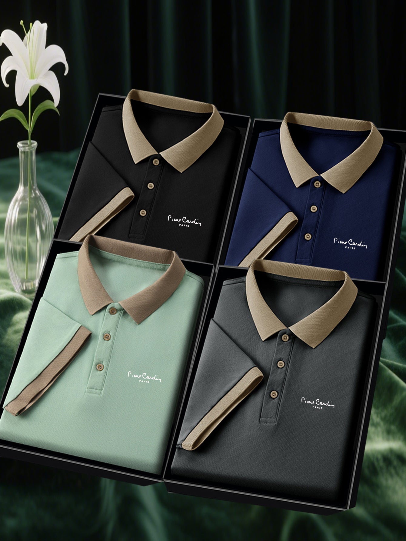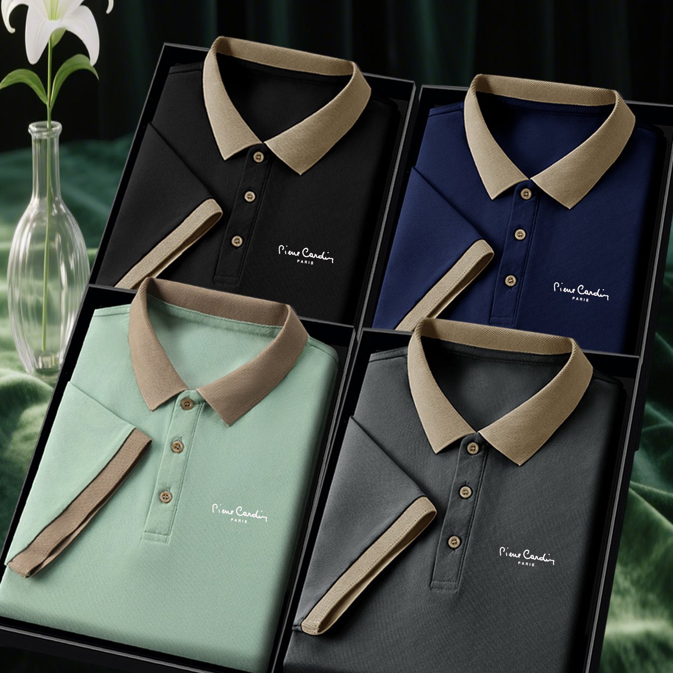 4 قطع قمصان بيير كاردن باريس للرجال - صيفية للأعمال والكاجوال، أكمام قصيرة قابلة للتنفس، تصميم مطبوع بشعار، 4 ألوان (أسود/أخضر فاتح/أزرق داكن/بيج)، مقاس عادي للجولف والتينس والمكتب - هدية مثالية للرجال