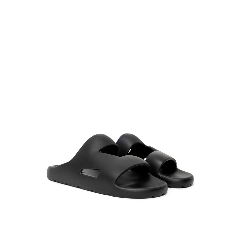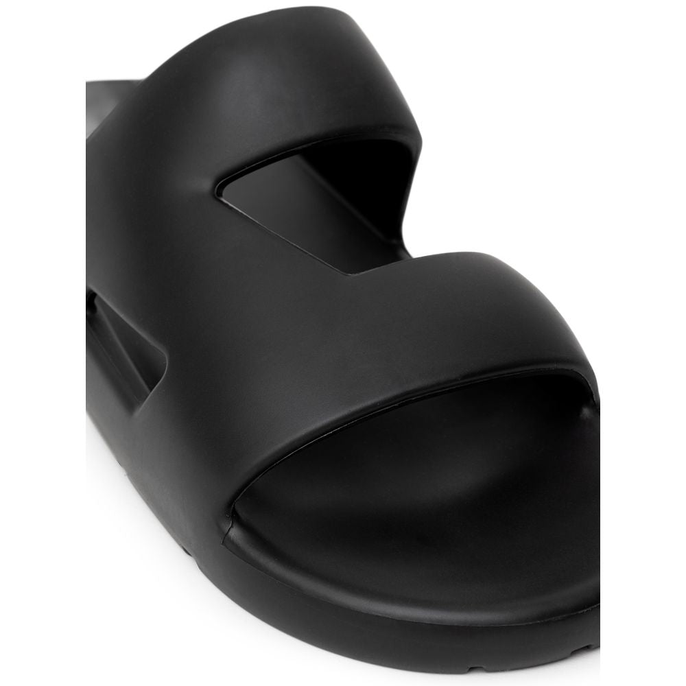 Black Rubber Sliders Bottega Veneta. Ergonomic shape, open toe, double rubber band on the instep, logo printed internally, satin effect. Internal SKU: 25FEB97. Brand SKU: 690103V11T0