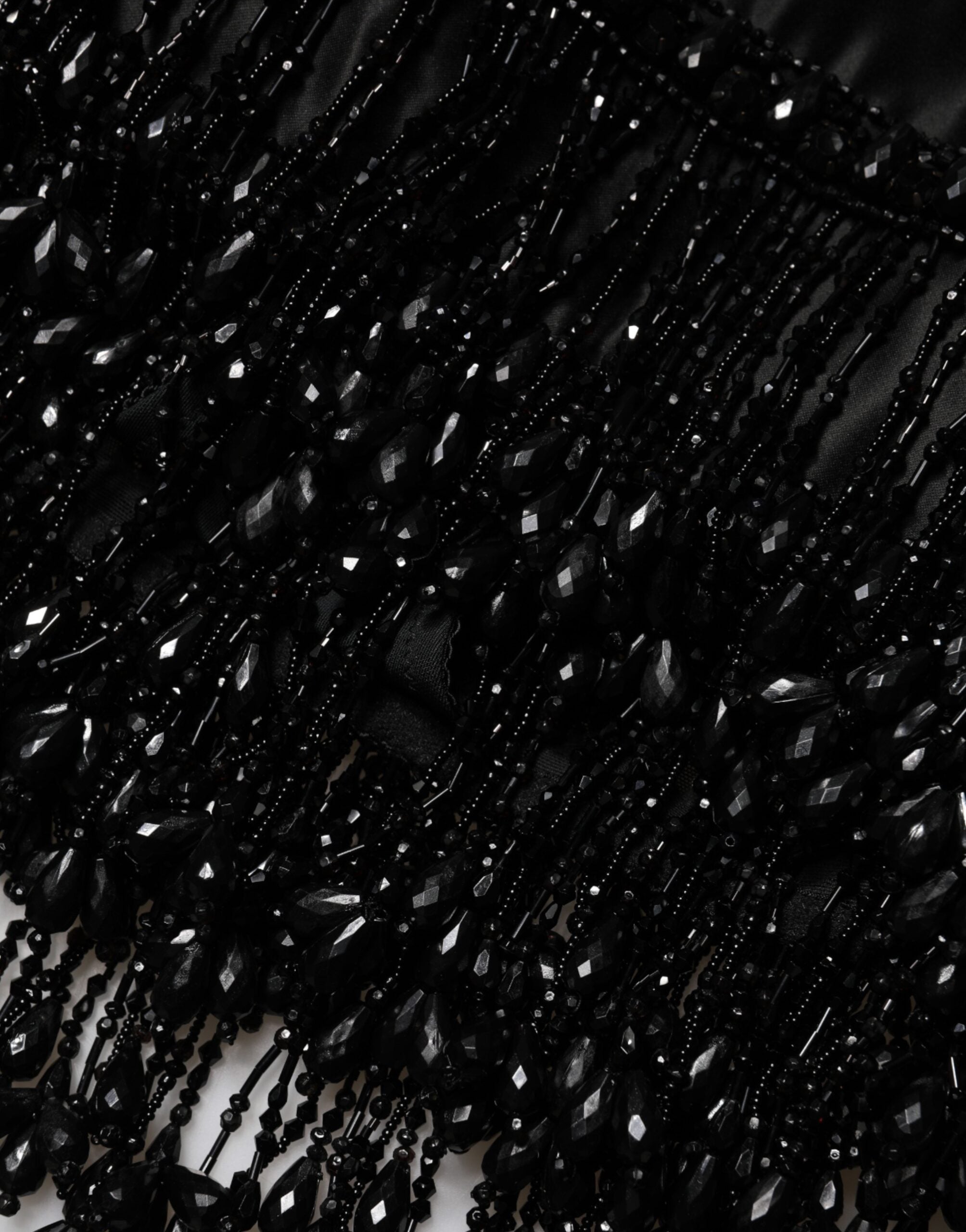 mini skirt features intricate lace detailing with subtle embellishments on sleek black nylon. Designed with a flattering silhouette, it combines feminine sophistication with modern statement style.