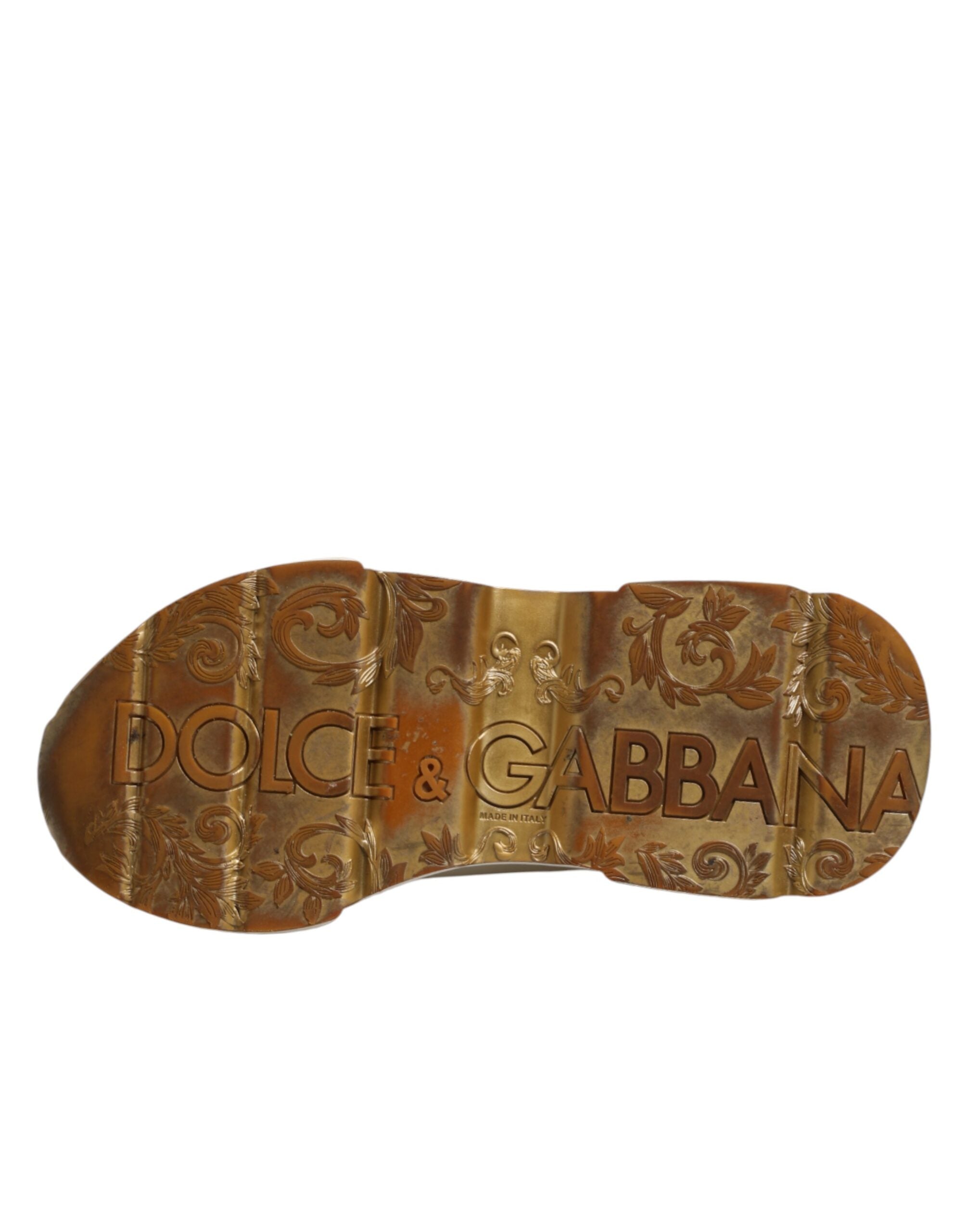 Gorgeous preowned, 100% Authentic Dolce & Gabbana Daymaster sneakers feature a sleek white and gold colorway that exudes contemporary luxury. Crafted from premium leather, they showcase a chunky silhouette with bold logo details and sculpted rubber soles for maximum comfort and style. The low-top design combines sporty energy with refined elegance, perfect for elevating everyday casual looks.