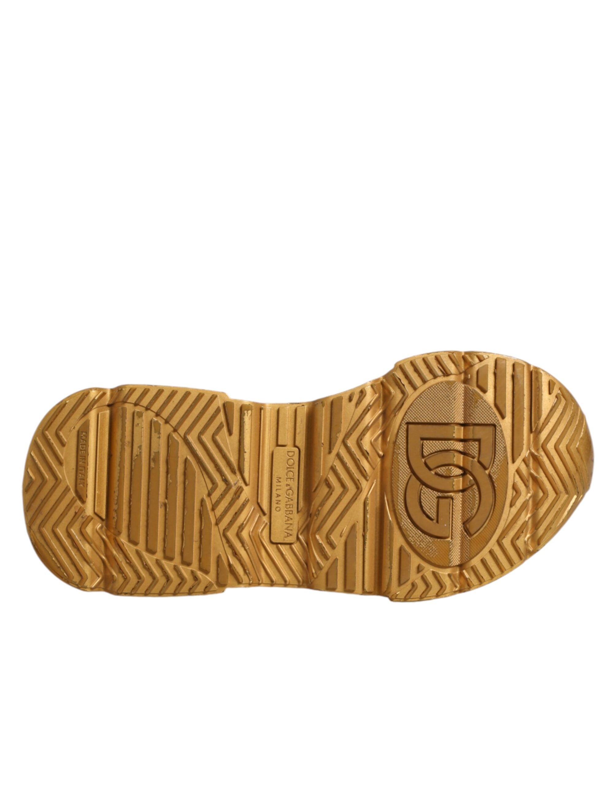 Gorgeous preowned, 100% Authentic Dolce & Gabbana Daymaster sneakers feature a sleek white and gold colorway that exudes contemporary luxury. Crafted from premium leather, they showcase a chunky silhouette with bold logo details and sculpted rubber soles for maximum comfort and style. The low-top design combines sporty energy with refined elegance, perfect for elevating everyday casual looks.