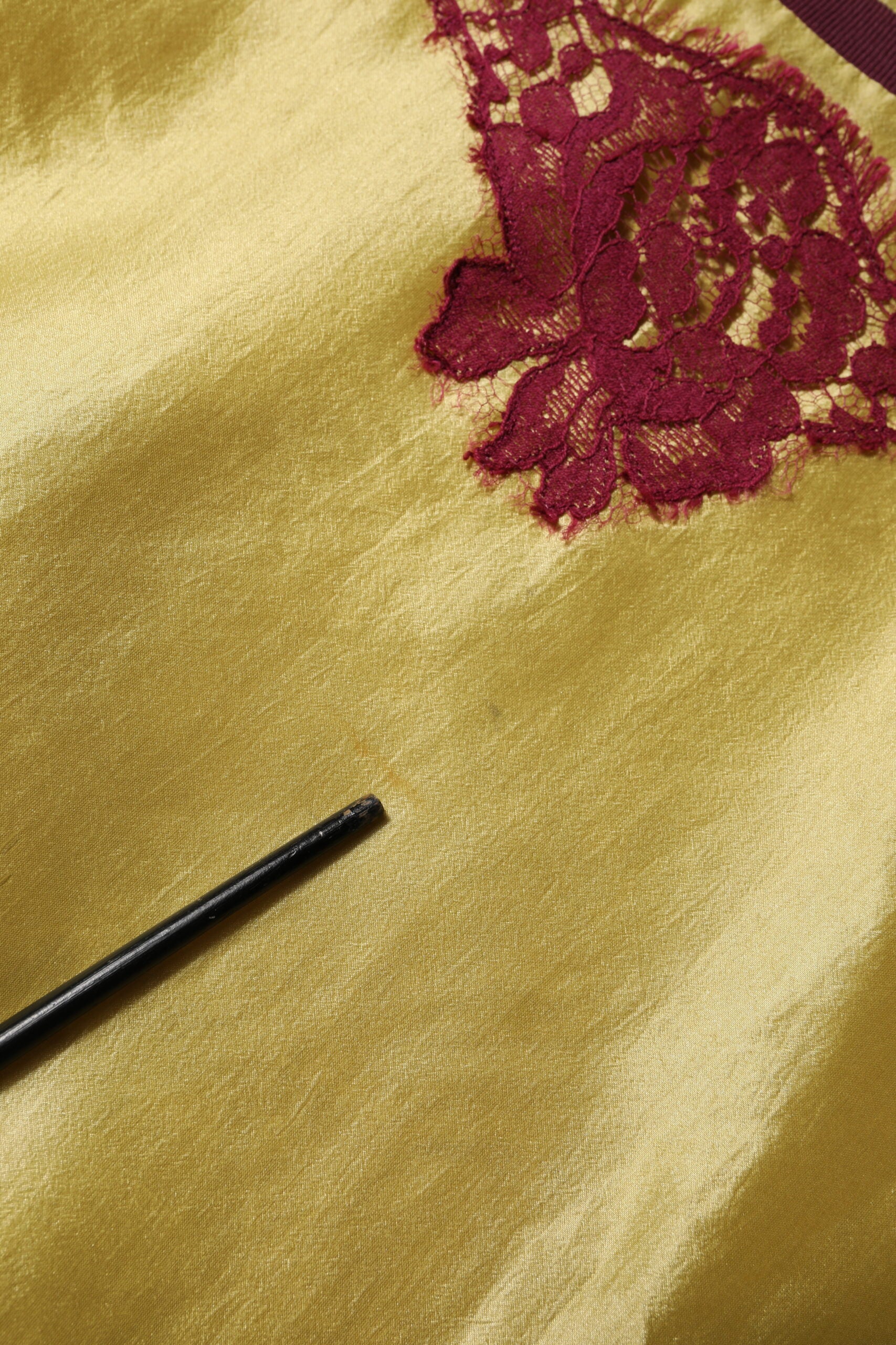 top is crafted from lustrous yellow silk satin, exuding luxury and sophistication. Featuring delicate floral lace detailing and short sleeves, it offers a feminine and refined look. Perfect for pairing with tailored trousers or skirts, this piece adds a touch of romantic elegance to any ensemble.